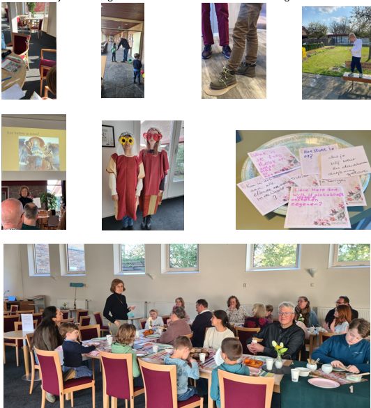 Er werd hard gewerkt aan het versieren van een speciale stoel, er werd bestek versierd, een code gekraakt, een parcours gelopen – soms zelfs met de ogen dicht én gerend op grote voet. Kinderen hebben bellen geblazen, optische illusies bestudeerd en zelf een optische illusie gemaakt. Ondertussen kwamen we steeds meer te weten of de Emmaüsgangers, waar ds. Coby de Haan tijdens de viering meer over vertelde. Tijdens het verhaal liepen de vrienden van Jezus, Kleopas en zijn vriend, verdrietig van Jeruzalem naar Emmaüs. In hun verdriet herkenden zij Jezus niet. Pas toen Hij het brood brak, werden hun ogen geopend. Wat een blijdschap bracht dit! Na de viering mochten we samen aan tafel gaan om ook daar met elkaar het brood te breken. Eén stoel bleef leeg, de versierde stoel, de stoel voor Jezus. Op Jezus bord kwam geen brood, maar alles wat wij op Zijn bord hebben gelegd. Zagen wij het goed? Bleef Zijn stoel leeg of is er toch meer dan we met onze ogen zien?